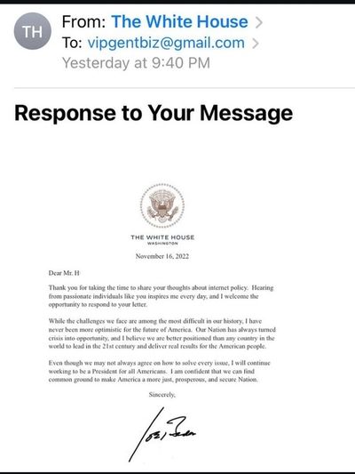We received an official reply from the Office of the President acknowledging the message. While this response was not written personally by President Joe Biden, it represents an important moment that reflects our long-standing commitment to public advocacy and systemic reform.